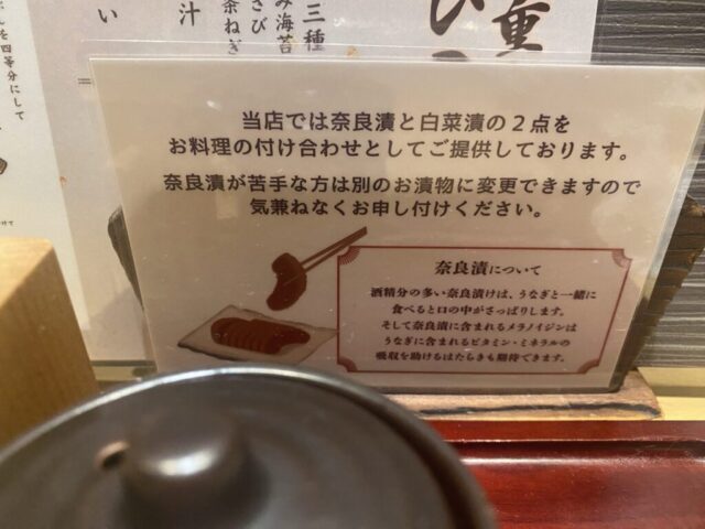 さて、うな重などのうなぎ料理には奈良漬けがついてきますが苦手な方は別のお漬物(白菜漬)に変更することが出来ます。