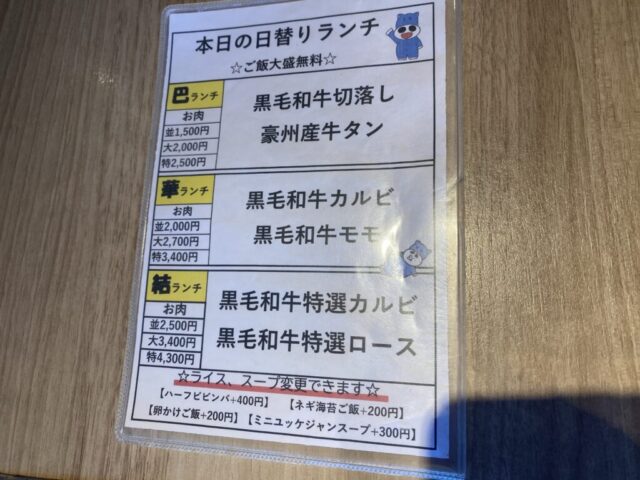 日替わりランチは「ミニ焼肉」などのオプションもあるので予算に余裕がある時はご利用ください。